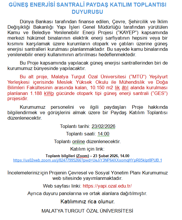 Türkiye Cumhuriyeti Çevre, Şehircilik ve İklim Değişikliği Bakanlığı Yapı İşleri Genel Müdürlüğü Kamu ve Belediye Yenilenebilir Enerji Projesi Malatya Turgut Özal Üniversitesi Yeşilyurt Yerleşkesi 1.188 KWp Otopark Tipi Güneş Enerjisi Santrali Çevresel ve Sosyal Yönetim Planı